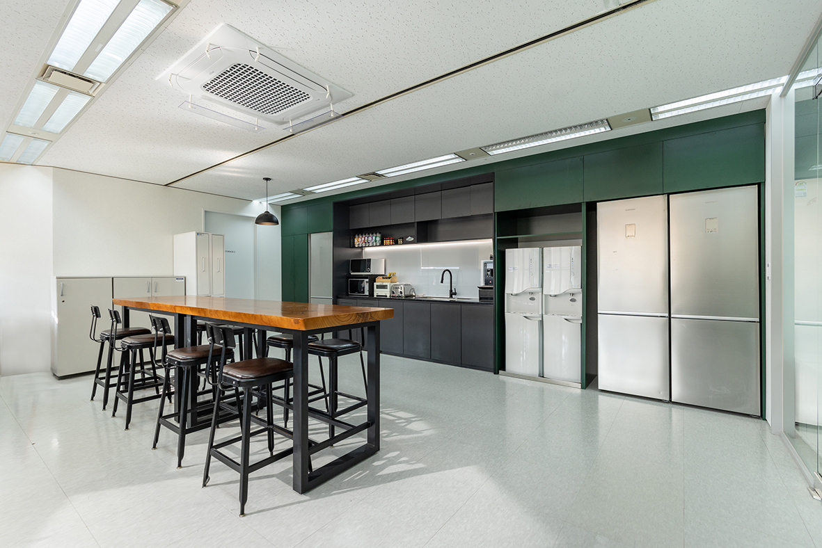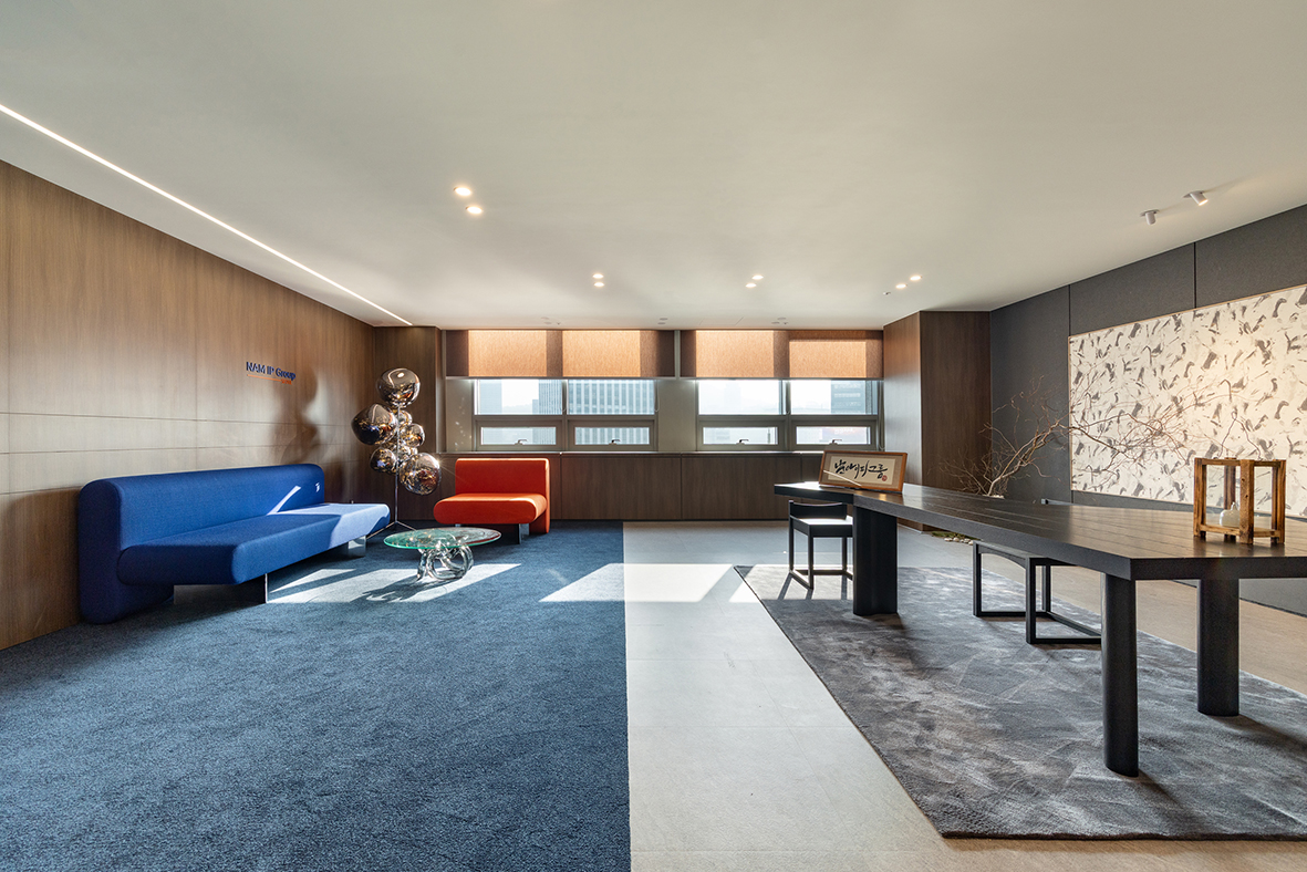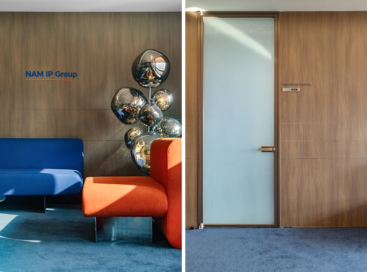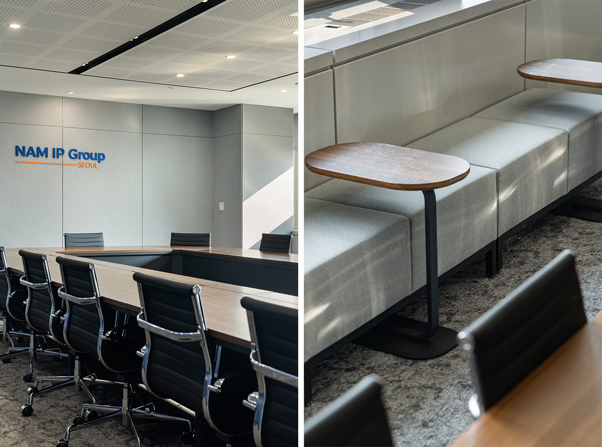 NAM IP Group의 라운지는 단순한 휴식 공간을 넘어, 회사의 정체성과 방향성을 담아낸 상징적인 공간이다. 하나의 공간 안에 과거와 미래의 의미를 담아, 서로 다른 두 가지 성격의 공간으로 구성하였다.