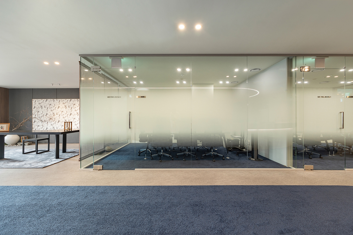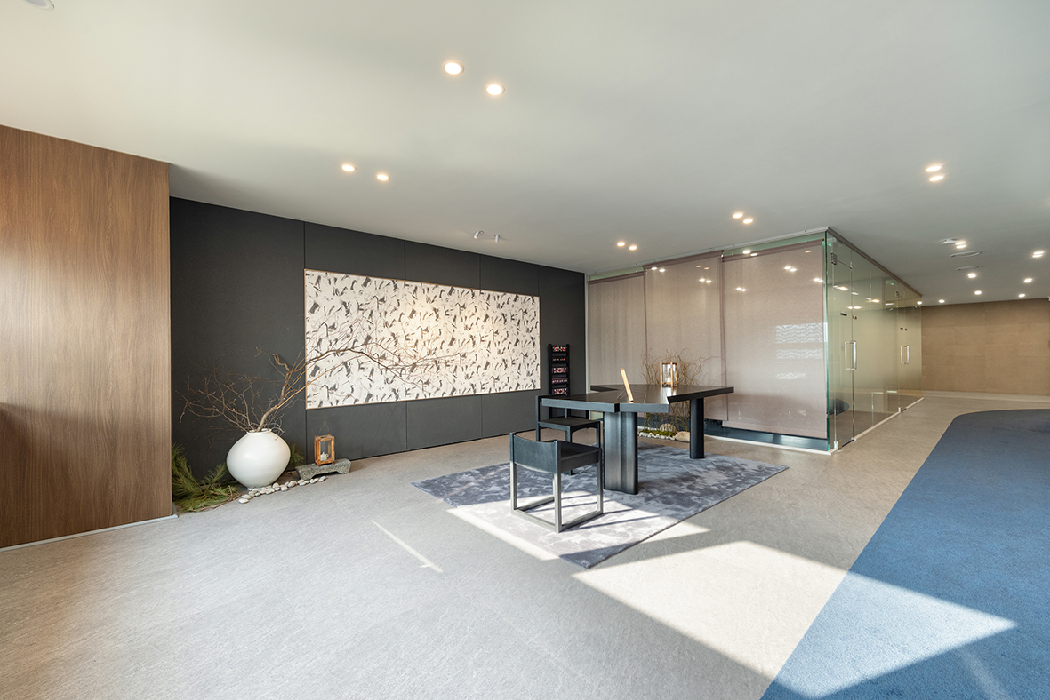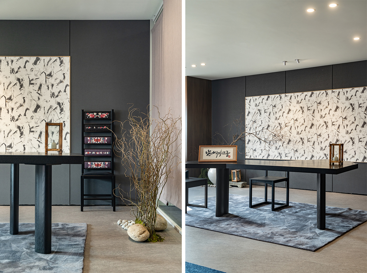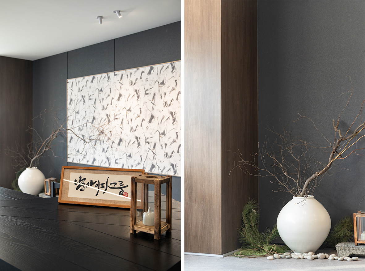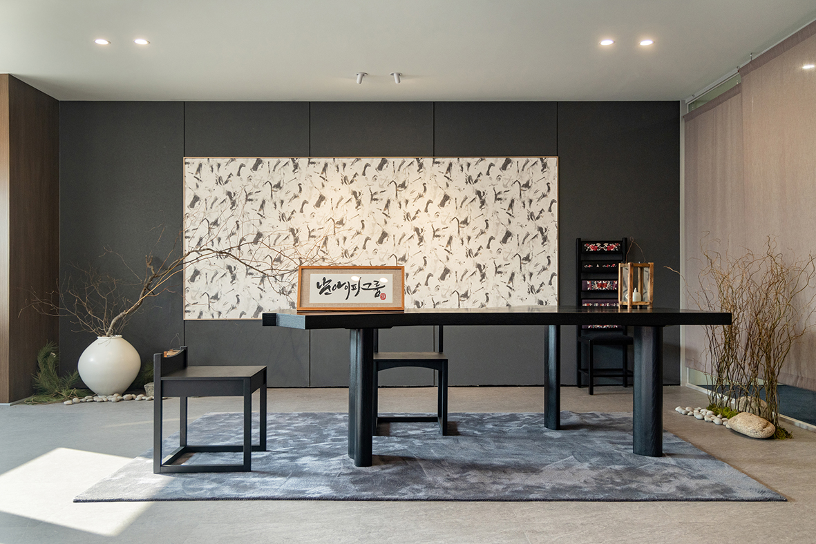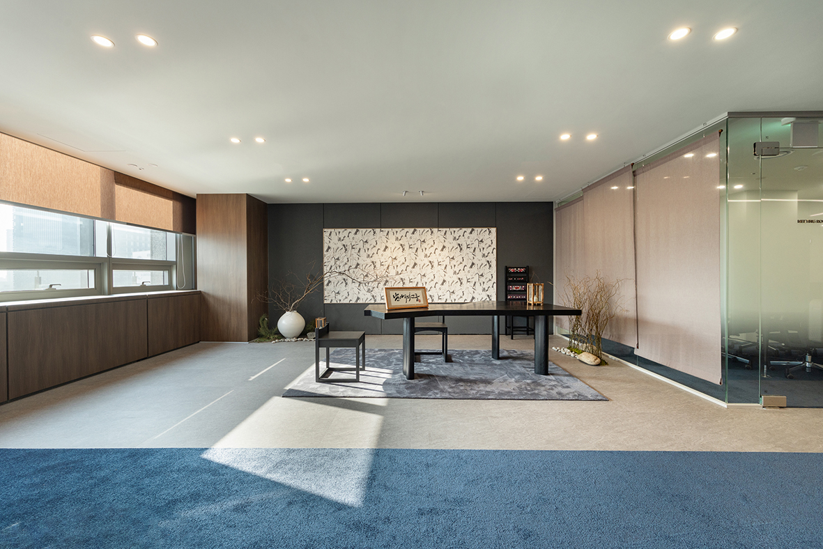 입구 오른쪽의 전통적인 공간은 오랜 시간 쌓아온 경험과 신뢰, 남아이피그룹의 뿌리를 상징한다. 중심에 놓인 달 항아리는 다복과 평안, 그리고 풍요로운 미래를 의미하며, 위로 곧게 뻗은 가지의 형상은 현재에 머무르지 않고 지속적으로 성장해 나가겠다는 의지를 담고 있다. 여기에 더해진 호롱불과 전통 의자는 사람을 귀하게 대하고, 고객과 함께 미래를 만들어가고자 하는 남아이피그룹의 태도를 보여준다.